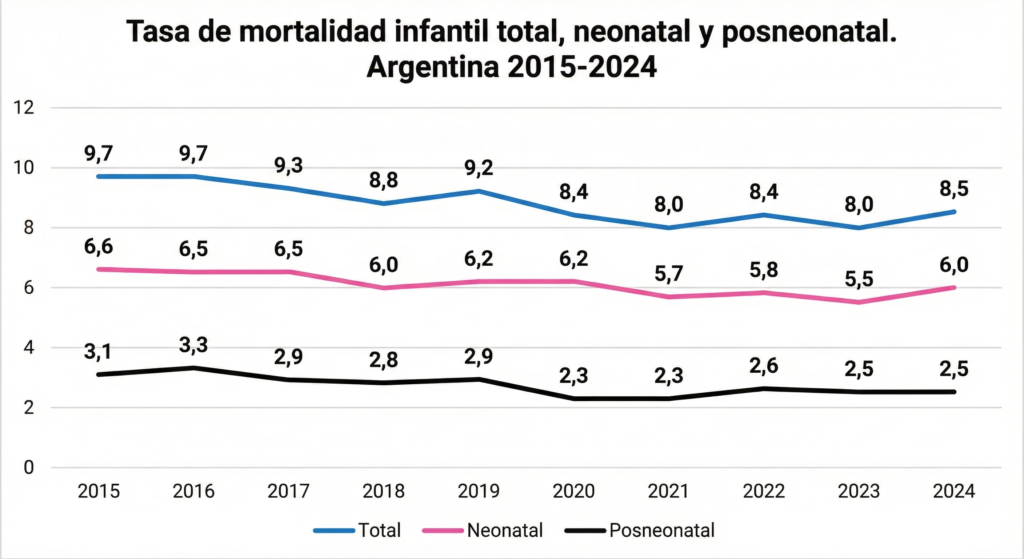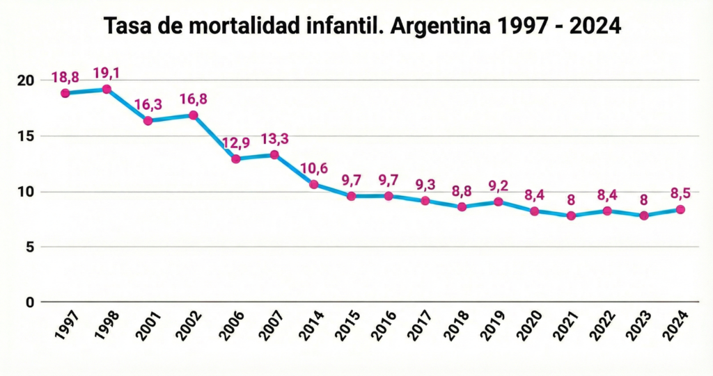 Sin embargo, en el último informe de estadísticas vitales del año 2024, se observa un incremento en la tasa de mortalidad infantil de 0,5 puntos respecto a 2023, lo que equivale a un aumento del 6,25%, representando 8,5/1.000 defunciones de nacidos vivos (aproximadamente 3500 fallecimientos en ese año). Se trata del mayor crecimiento desde 2002.